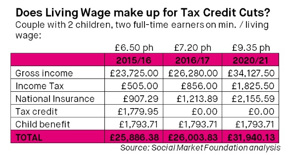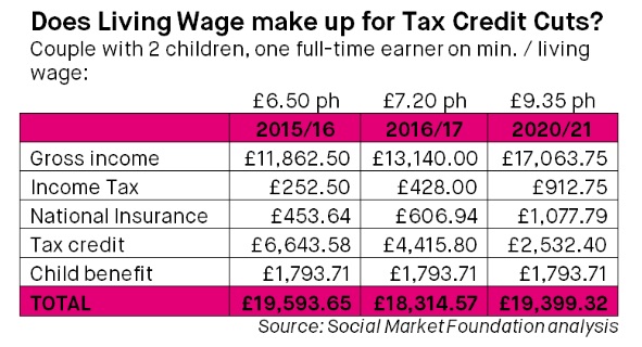 The Budget headlines George Osborne wanted were all about the gains to working families from raising the income tax threshold and the new National Living Wage. However, these go nowhere near to making up for the losses above. The threshold rises to £11,000 from 2016/17 but someone earning below that gains nothing and most of the benefits go to people up the income scale. The National Living Wage will be introduced at £7.20 an hour from April 16. That means people on the £6.70 an hour minimum wage will gain 50p an hour but even a couple both working 35 hours a week only gain around £1,820 a year. In addition, it does not apply to people under 25 and it remains to be seen whether employers will seek to cut back other job perks (if there are any) to pay for the increase.
