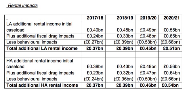 Next it comes up with figures for increased rental income and behavioural responses by tenants that may reduce it. Extra local authority rents go back to the Treasury but housing associations keep their increased income. The assessment does not include the effects of a taper but it does make assumptions about actions by tenants that could reduce this. Examples include increased rent arrears, movement out of the sector through choice and affordability, tenants reducing their income to avoid the thresholds or exercising the right to buy (perhaps the easiest way out for anyone who can afford it and not of course in any way a subsidy). It’s not hard to think of others but I’ll go with these assumptions for now.