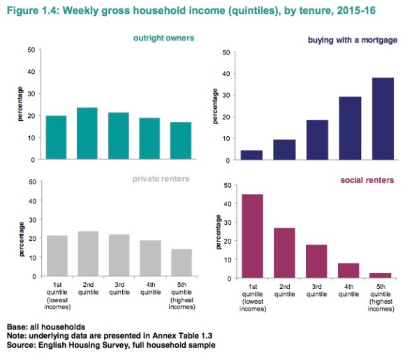 In a housing market characterised by high house prices, it’s not surprising that it’s the highest earners who are able to buy. The next graph shows weekly household income by quintiles in each tenure going from the fifth of households with the lowest incomes on the left to the fifth with the highest incomes on the right:
