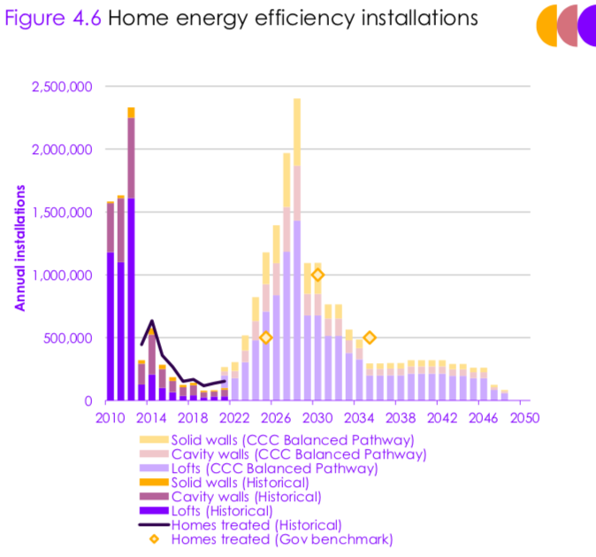 This graph from the report shows not just the gap between what’s being achieved now and what’s needed but also the scale of the slump after the government cut support for retrofits and cut the ‘green crap’ in 2012: