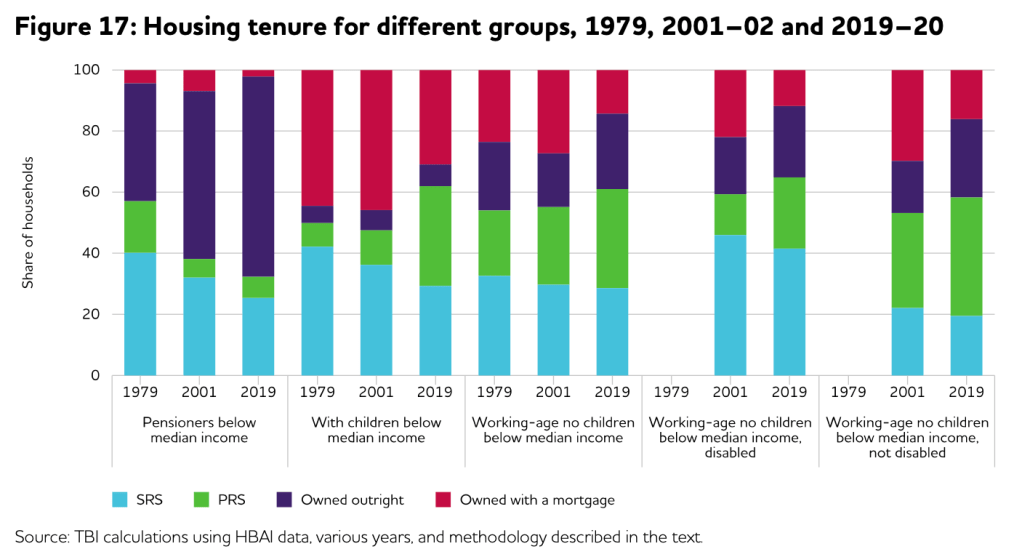For some, like pensioners, the growth in home ownership has been marked but the share of working age households with children below median income who are renting privately has risen from one in ten to one in three as home ownership and social renting declined.