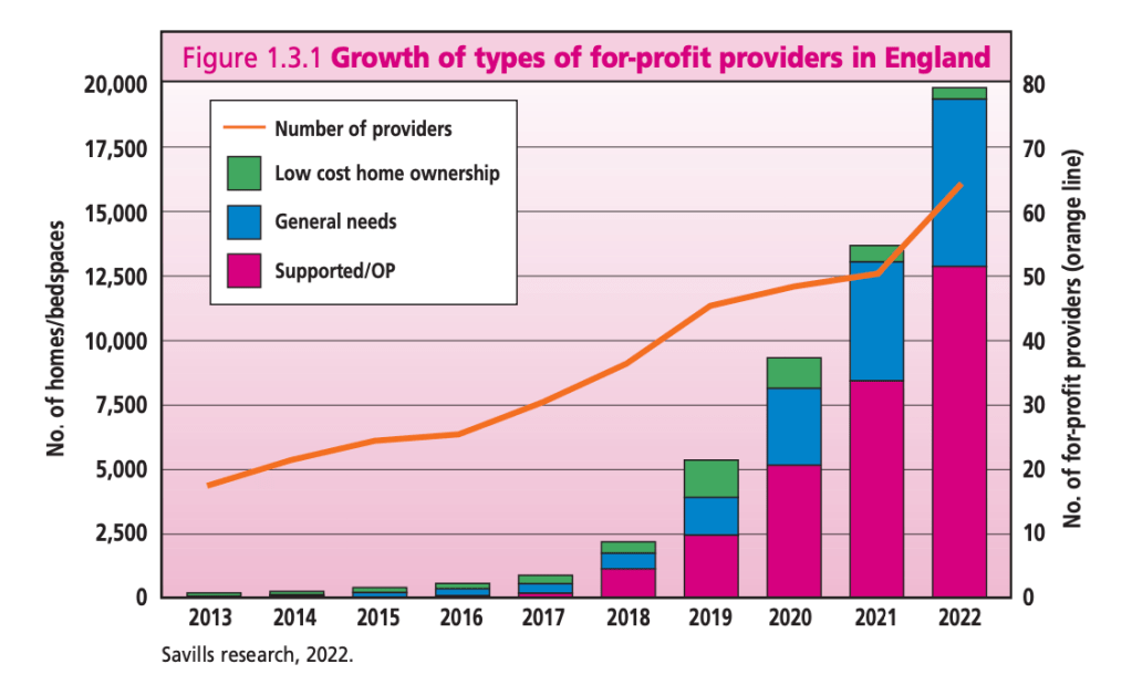 This graph shows the rapid growth in the number of homes and bedspaces owned by different types of for-profit providers over the last 10 years in England: